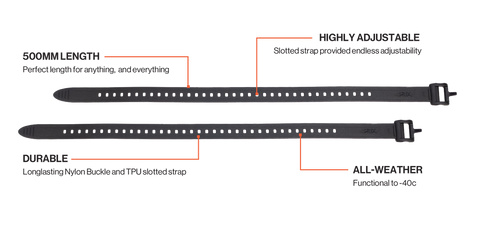 The ‘do-anything’ straps. Flexible, durable polyurethane straps to lash your RUX 70L or Waterproof Bag to your vehicle, ATV, cargo bike, snowmobile, boat, or wherever else you need it.